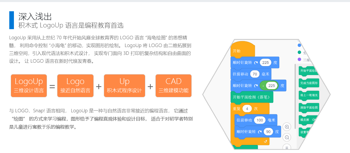覆盖小学至大学的编程教育及三维创新设计,作为清华大学选修课的国产3D软件,1.作为清华大学选修课的国产3D软件,积木式与代码同步进行,使得学习编程由幼儿到大学均可入门与到专业的无门槛学习软件,软件业已达到准工业级应用
